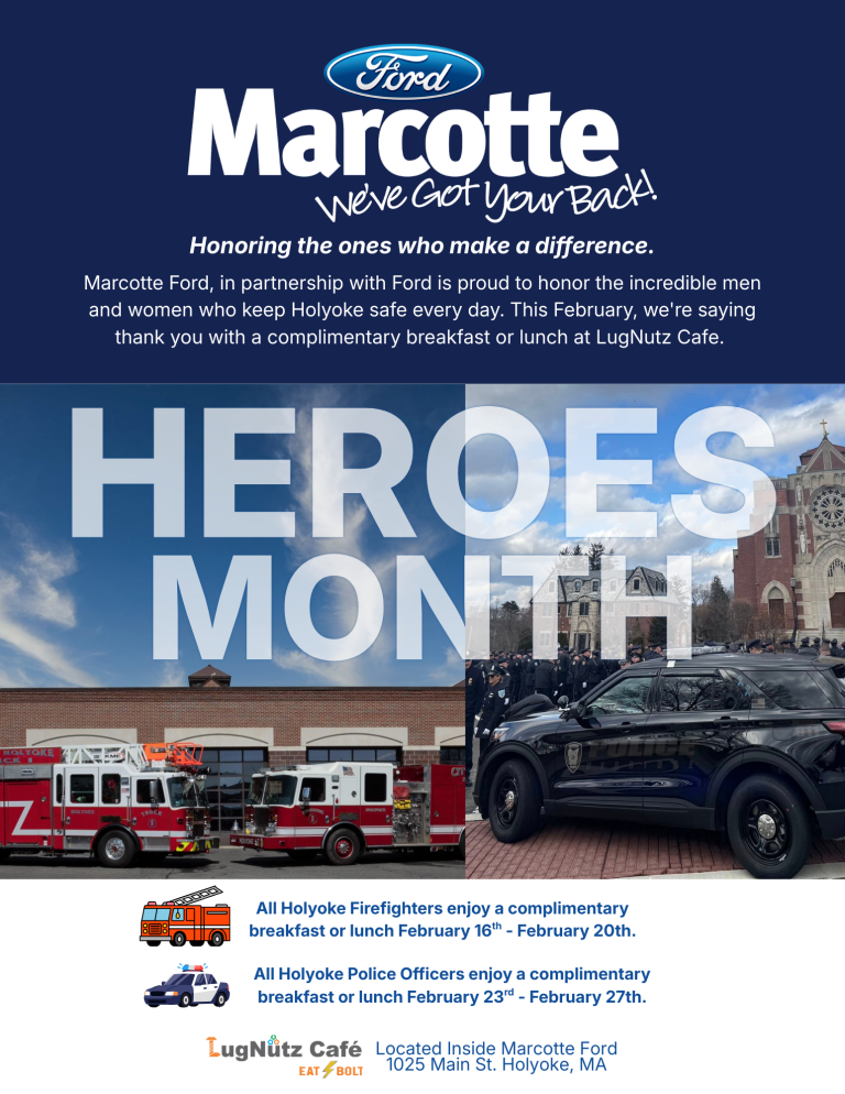 LugNutz Cafe and Marcotte Ford welcomed Guest Chef Chief Pratt, Chief of Holyoke Police, to celebrate his upcoming retirement and to serve his Paddy Wagon burger! $2 of each meal purchased during lunch was donated to Chief Pratt's charity of choice - Holyoke Safe Neighborhood Initiative. Congratulations on retirement Chief!